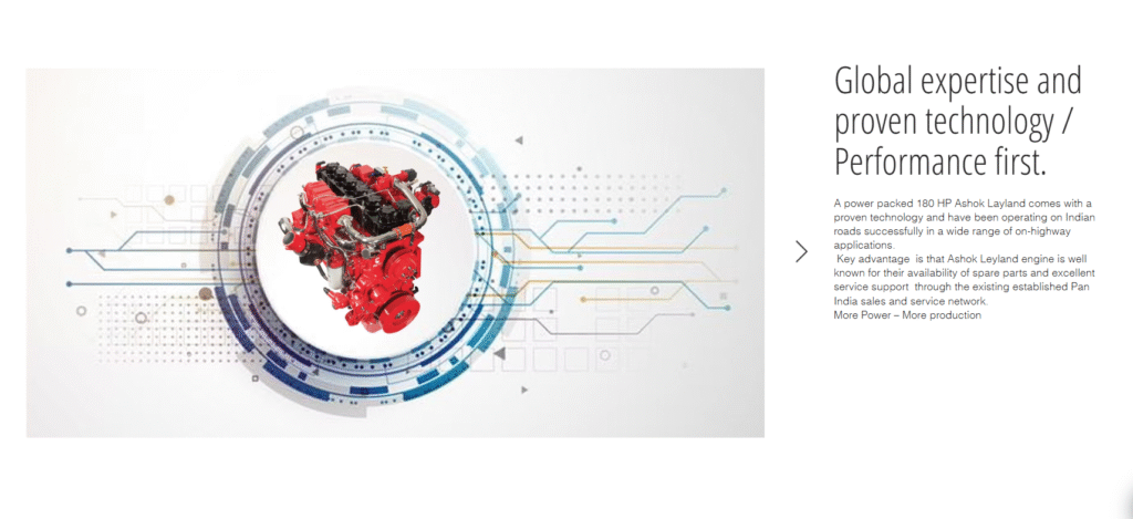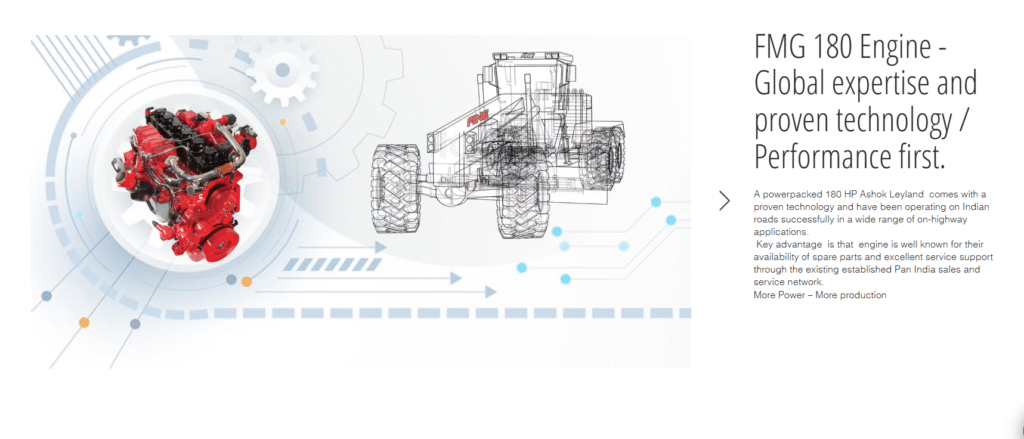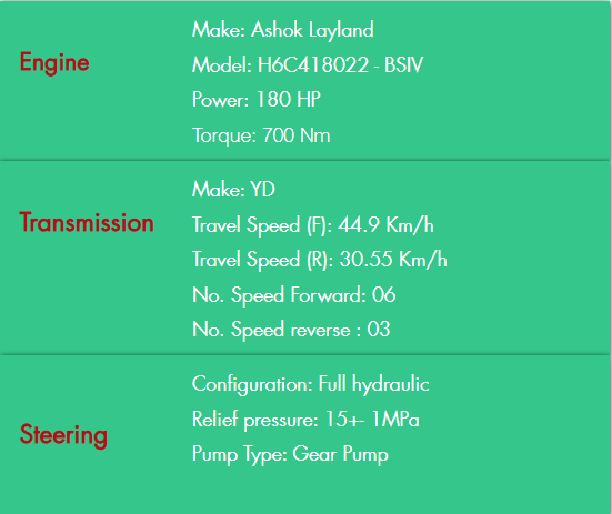 The FMG180 is powered with Ashok Layland engine which is ideal for this application as it produces the required torque at low engine speeds delivering responsiveness and fuel efficiency. These engines run cleanly without extra service required for additional equipment or after treatment of exhaust gases. The transmission has been selected to optimize the engine performance and enhance overall fuel efficiency by matching engine power to the application.