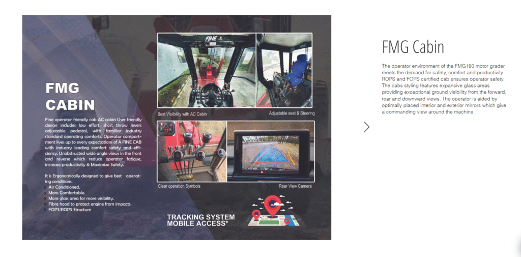 The operator environment of the FMG180 motor grader meets the demand for safety, comfort and productivity. ROPS and FOPS certified cab ensures operator safety. The cabs styling features expansive glass areas providing exceptional ground visibility from the forward, rear and downward views. The operator is aided by optimally placed interior and exterior mirrors which give a commanding view around the machine.