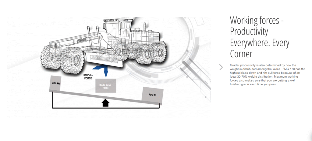 Wide stance blade lift cylinders provide the most stable grading platform in the industry. The hydraulic motor coupled to the drive circle turn system results in the precise instantly responsive earthmoving tool. It also provides high strength to hold or turn the moldboard smoothly while negotiating maximum loads. This helps in more accuracy and performance resulting into single pass finishes, which make FMG 180 contribute significantly to productivity and cost saving.